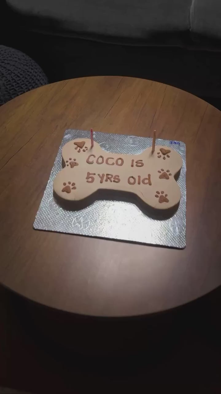 Make your dog's birthday extraordinary with our "Pawsonalized Bone Bash" cake. This bone-shaped treat is the perfect canvas for your heartfelt message, topped with nutritious yogurt and peanut butter paw designs.