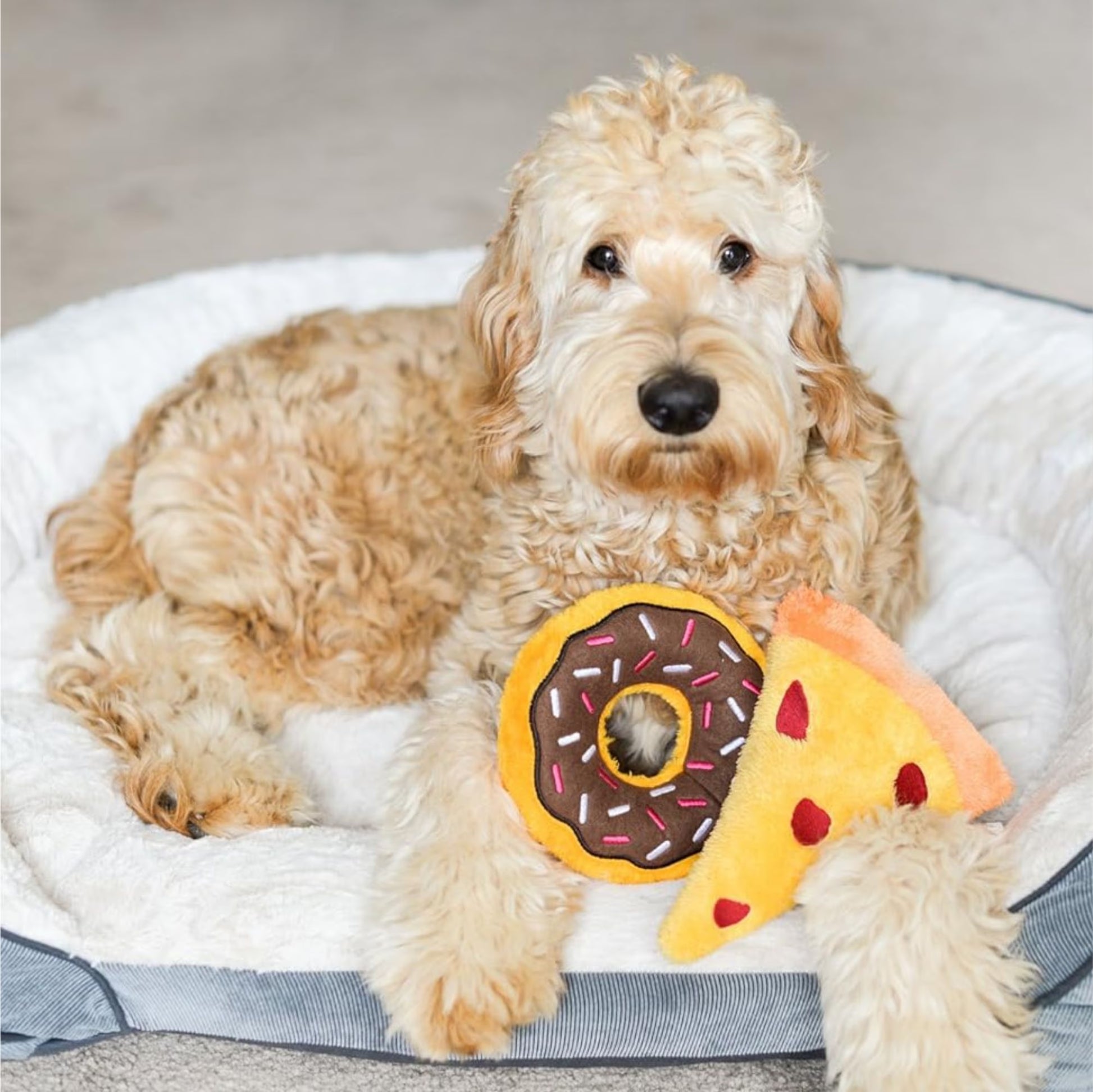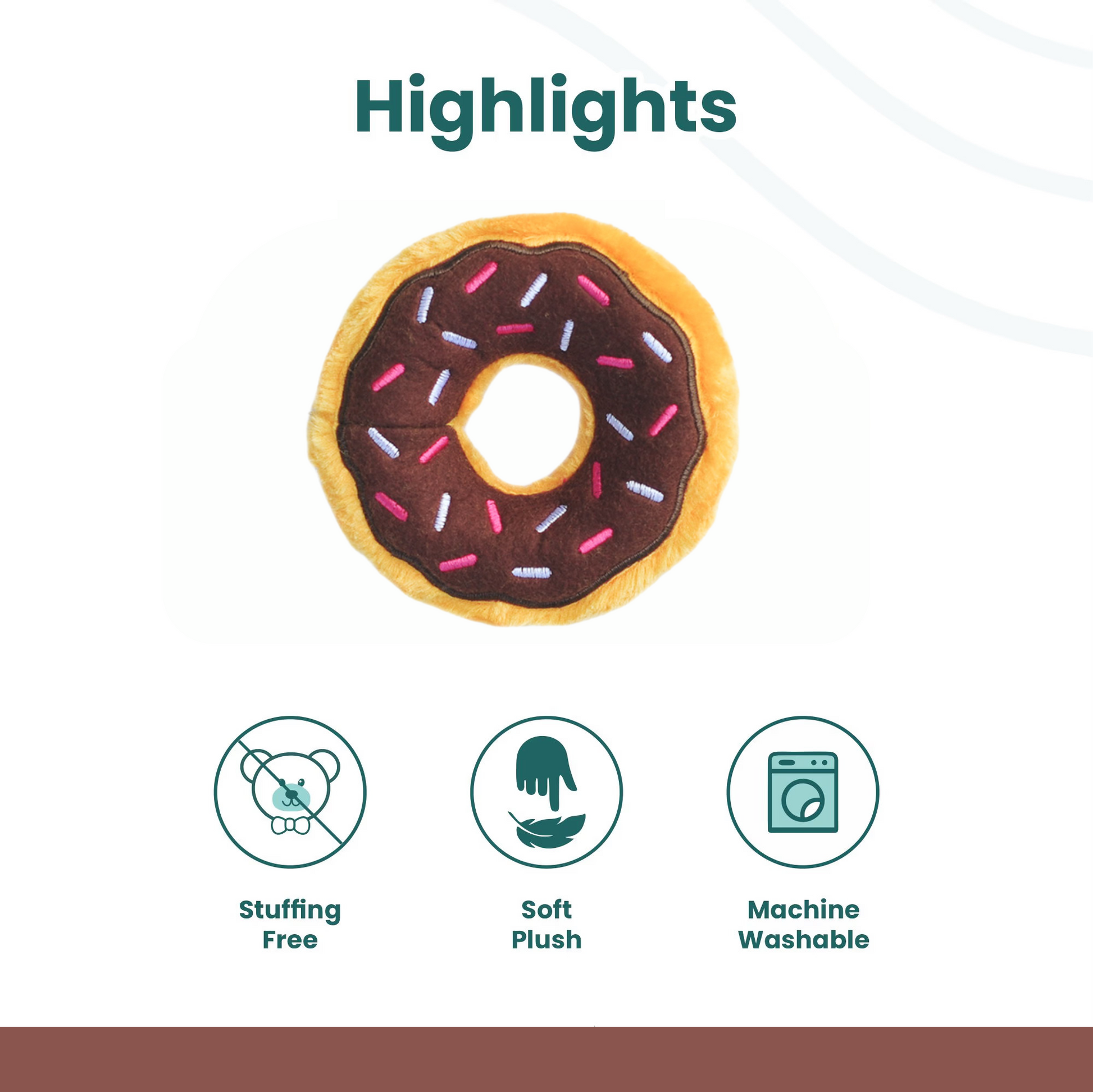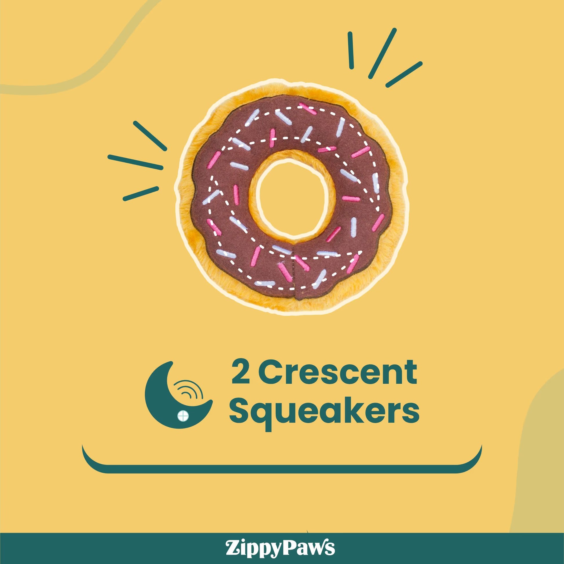 Embroidered "sprinkles" and toppings make them look like real delicious donuts! Each donut includes 2 exclusive mini crescent squeakers. No stuffing. 5 x 5 x 1 inches.